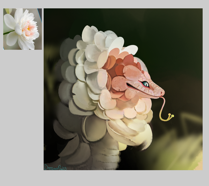 Turo was moving carefully, even ducking a few flowering vines hanging from the ceiling of the greenhouse part where various lattices were propped and built up for the running vines to cling to as they grew. His hand lifted up, a much thicker vine moving and lowering down a larger flower that... opened up to show a Snake-like face hidden amongst the petals; its head rested on that hand for support, pollen coated tongue flicking out.]